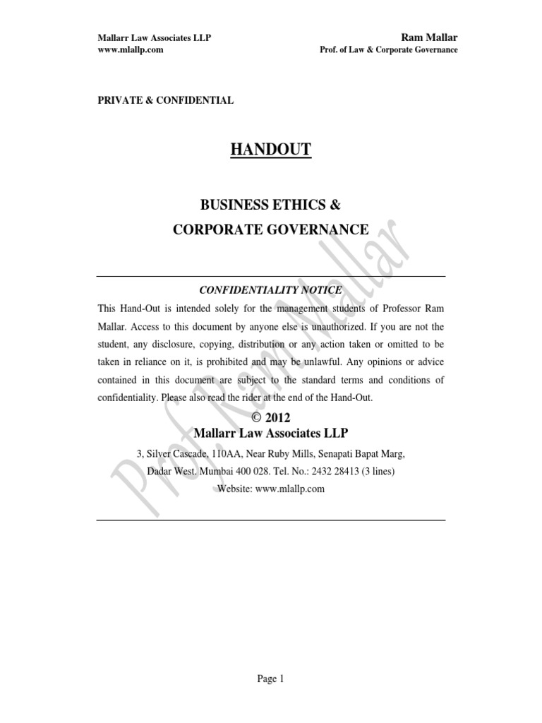 Handout On Business Ethics Corporate Governance Pdf Business